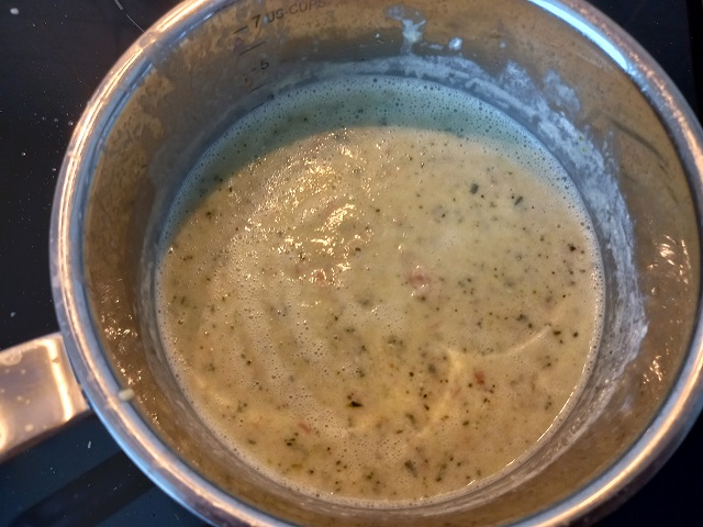 Voeg de spekjes en de roomkaas en wat zout en peper toe. Breng aan de kook en laat 20 minuten zachtjes koken.