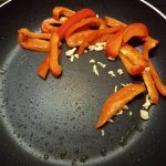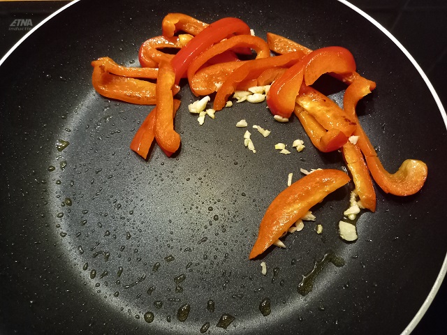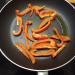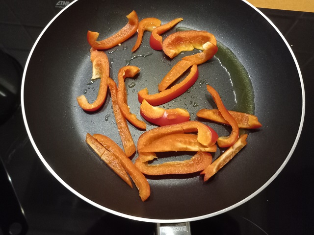 1. Verhit de olie in een koekenpan en bak de paprika tot ze een beetje zachter beginnen te worden.
