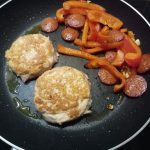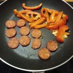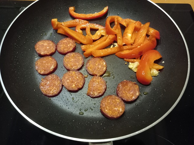 3. Voeg de plakjes chorizo toe en laat deze 5 minuutjes meebakken.