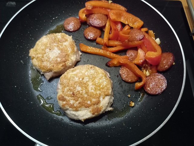 4. Schuif alles naar 1 kant en bak de kipburgers aan beide kanten tot de kipburgers gaar zijn.