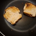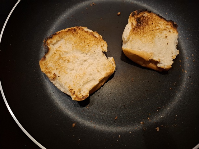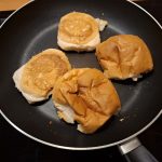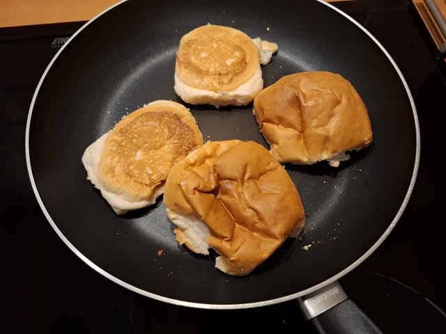 3. Snijd de broodjes horizontaal door en grill ze zachtjes in een droge koekenpan.