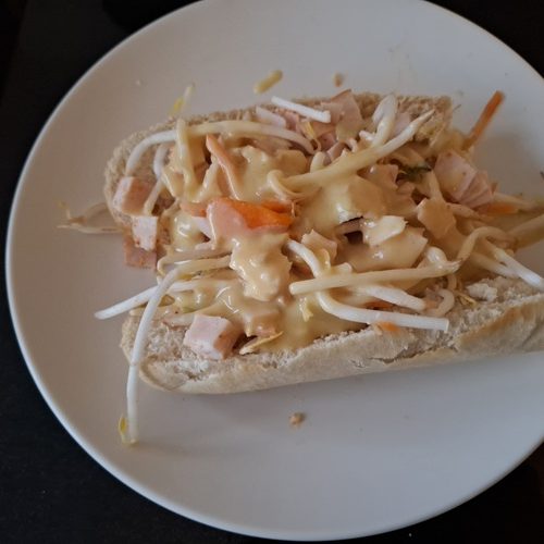 Stokbrood met gerookte kip en taugé