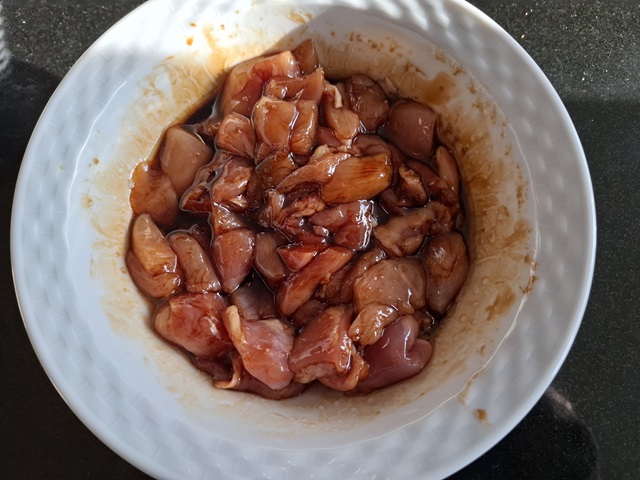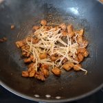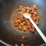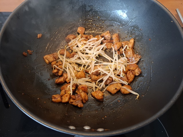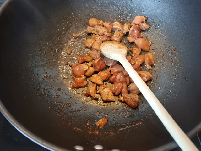 Bak de kipblokjes in de wok zonder nog olie toe te voegen.