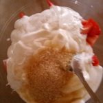 Doe de yoghurt in een kom met de aardbeien en de suiker. Meng goed door elkaar.