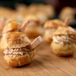 2. Klop in een met citroensap ontvette kom van de keukenmachine de eiwitten eerst schuimig. Voeg beetje bij beetje de suiker toe en blijf doorkloppen tot het eiwit stevige pieken vormt. Roer de maïzena door de witte wijnazijn en meng door het eiwitschuim. Schep het schuim in een spuitzak met spuitmond en spuit dopjes schuim van 1,5 centimeter doorsnede. Droog ze circa 5 minuten in de oven en steek je vinger in de mini-pavlova. Zet ze terug in de oven en laat een uur tot anderhalf uur volkomen bros worden. Laat ze afkoelen en bewaar in een goed afgesloten bak.