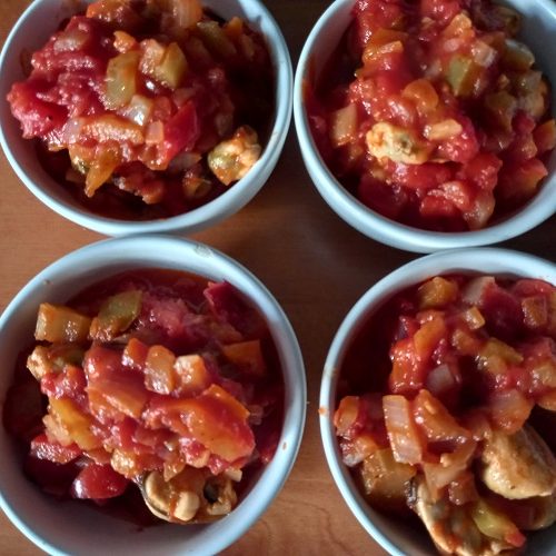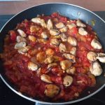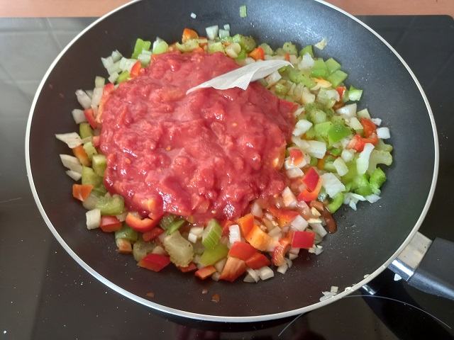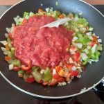 Zodra de ui glazig is voeg je de tomatenblokjes en het kruidenbuiltje toe. Dek af met het deksel en laat 30 minuten zachtjes stoven.