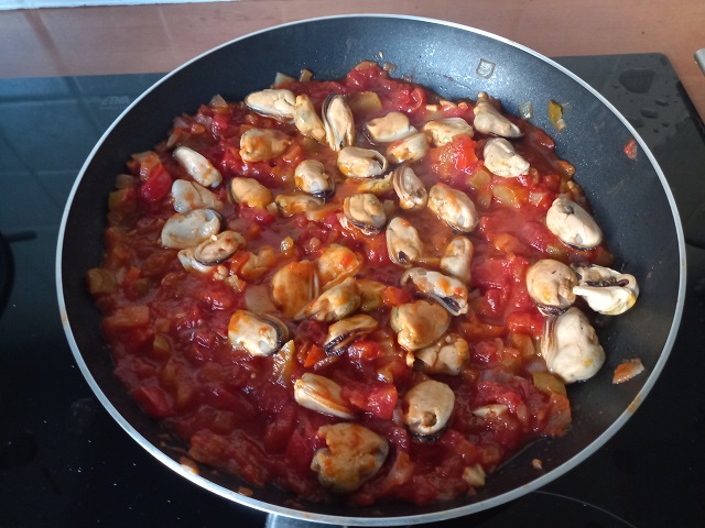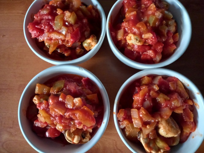 Haal de deksel van de pan en voeg de mosselen toe. Laat 5 minuten meekoken. Proef de saus en breng eventueel verder op smaak met wat zout en peper. Verwijder het kruidenbuiltje. Verdeel over de schaaltjes of bordjes. Dit kun je zowel warm als op kamertemperatuur serveren.