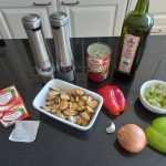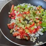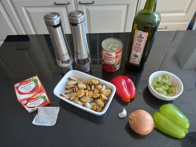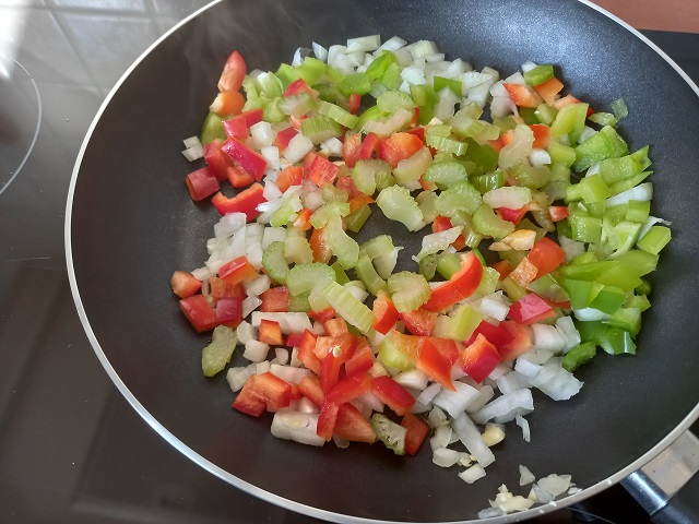Zet alle ingrediënten klaar. Pel en snipper de ui en knoflook. Snijd de stengel bleekselderij maatjes. Snijd de paprika's in blokjes.