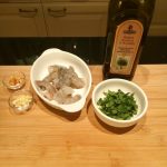 Zet alle ingrediënten klaar. Pel en hak de knoflook fijn. Pel de garnalen en verwijder het darmkanaaltje. Hak de peterselie en basilicum fijn.