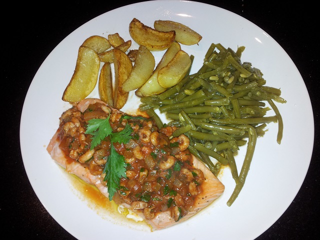 Meng in een kom ketchup, ceème fraîche, tomatenpuree, cognac, zout en wat piment d’espelette. Proef en breng op eventueel verder op smaak met zout en piment. Meng de garnaaltjes er door heen.