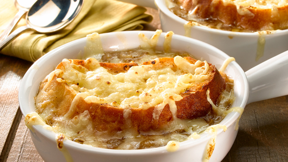 Schep de soep in kommen. Leg er een plakje stokbrood op en strooi er wat gruyère over. Zet de kommen in de oven en laat gratineren. Dat duurt ongeveer 10 minuten.