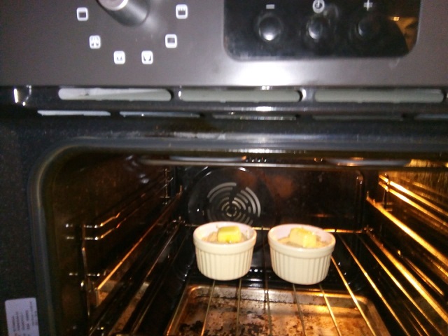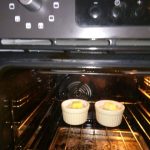 Kook het ei in 10 minuten hard. Laat afkoelen en pel deze. Snijd over de lengte doormidden. Snijd de zalm in stukken en verdeel over de ramequins. Leg er een half ei op.Lepel er 4 lepels bechamelsaus over. (klik op de link voor het recept)