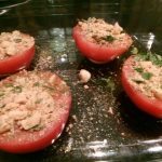 Strooi er dan de geraspte Parmezaanse kaas en vervolgens wat paneermeel. Leg er een klontje boter op en zet in de oven.