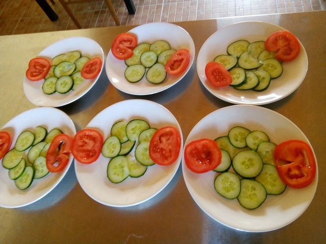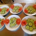 Pel het ei en snijd in plakjes. Leg wat plakjes komkommer op een bord. Leg daar een hoopje tonijn op. Ik gebruikte daar een ijslepel voor. Druk wat plat en leg daar nog een aantal plakjes komkommer op. Leg daar een plakje ei op en daar bovenop een ansjovisje. Leg rondom het hamburgertje de plakjes tomaat.