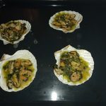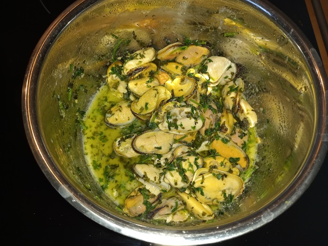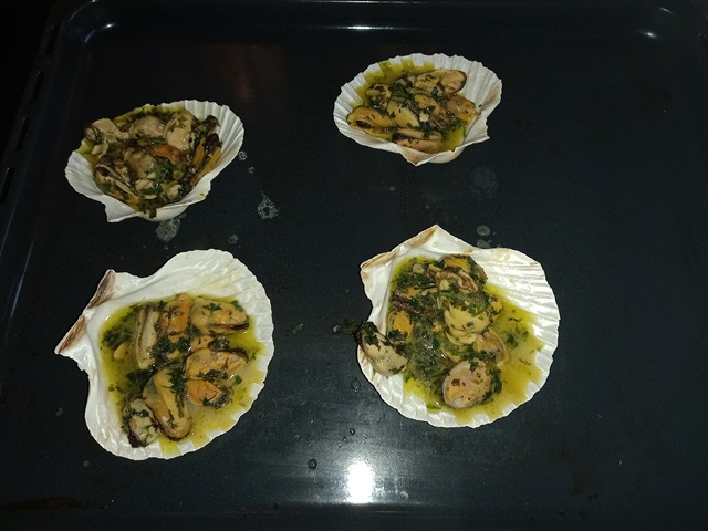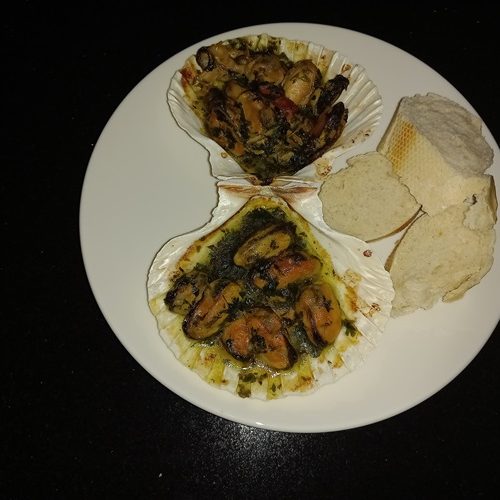 Een Frans voorgerecht. Het betekent zoiets als gevulde mosselen. Het zijn eigenlijk meer mosselen in een knoflookbotersaus.4