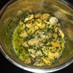 Voeg de mosselen en wat zout en peper toe. Meng goed door elkaar zodat de mosselen goed bedekt zijn met de saus.