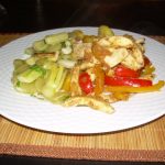 Snijd de plakken zalm in reepjes.