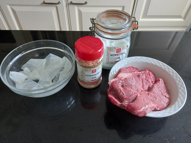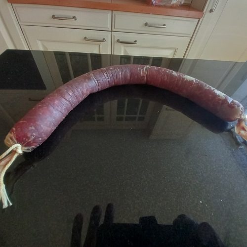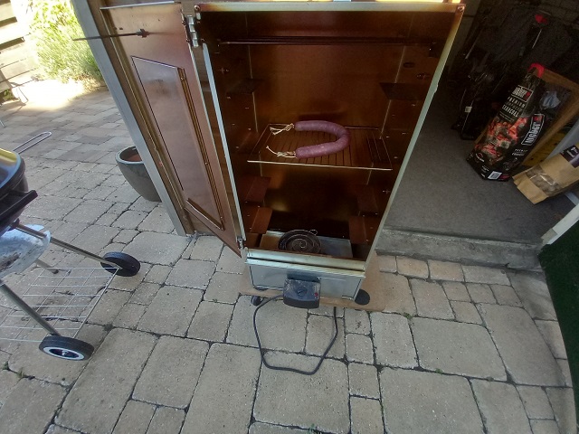 PS. Heb je geen rookoven en rookgenerator gebruik dan b.v. een verhuisdoos en een vuurvast schaaltje voor de rookmot en hang de worst aan beide uiteinden boven in de doos.
