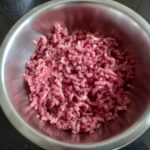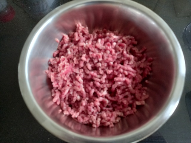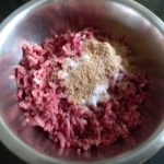 Maal het vlees door het eerst in blokjes te snijden en dan grof te malen door de 8 mm. plaat.
