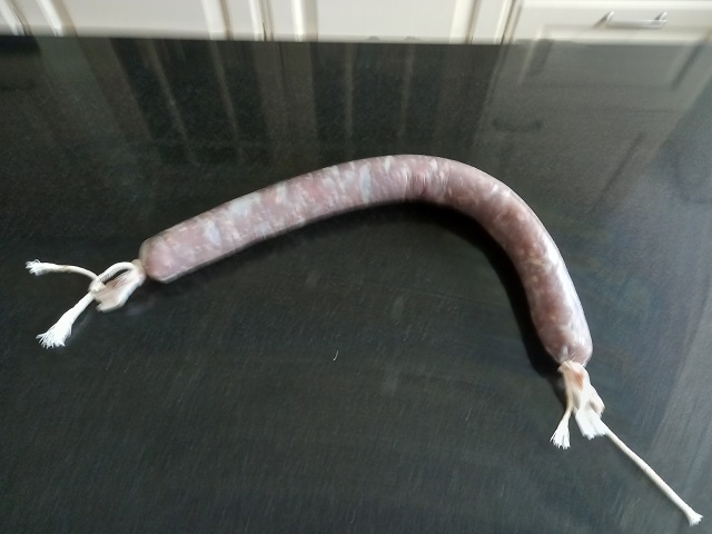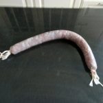 Vervang de 8 mm. plaat door de vulpijp. Schuif de darm op de pijp. Laat 5 cm van de darm vrij en vul de darm met het vleesmengsel. Knoop beide einden af met een stukje keukentouw. Leg de worst gedurende 1 nacht in de koelkast.