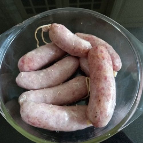 Gaar de worstjes door ze in een pan kokend water te doen en 5 minuten zachtjes laten koken. Je kunt ze hierna bakken of invriezen.